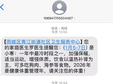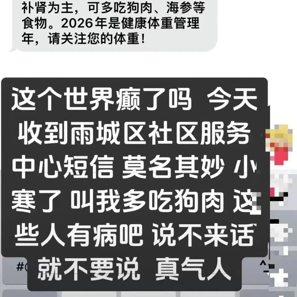 1月5日,有网友晒出了四川省雅安市雨城区青江街道社区卫生服务中心发送的一则短信。短信内容主要是健康提醒,其中写道:“1月5-7日是小寒,一年中最冷时段之一,加强保暖,适当运动,增强体质。饮食以温热补肾为主,可多吃狗肉、海参等食物。”