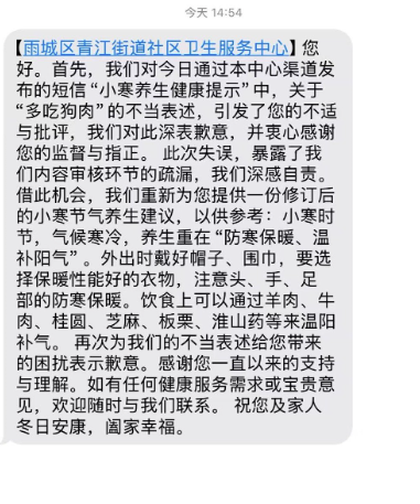 该工作人员表示,短信发送后,就有当地市民向他们反馈此种宣传方式欠妥,随后他们便迅速向市民发送了一条致歉短信,并重新修订一版养生建议。上述工作人员提供的短信截图显示,这条致歉短信提到:“我们对今日通过本中心渠道发布的短信‘小寒养生健康提示’中,关于‘多吃狗肉’的不当表述,引发了您的不适与批评,我们对此深表歉意,并衷心感谢您的监督与指正。此次失误,暴露了我们内容审核环节的疏漏,我们深感自责。”