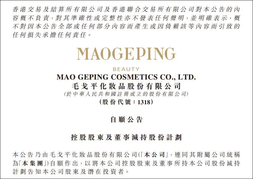 1月6日晚,港股上市公司毛戈平公司发布减持公告,公司控股股东毛戈平、汪立群夫妇及其姐弟等基于自身财务需求,拟在6个月内通过大宗交易方式合计减持不超过1720万股,即不超过公司已发行股份总数的3.51%。
