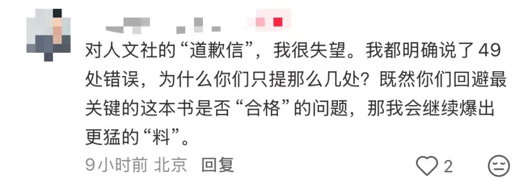 人民文学出版社表示:“向广大读者致以诚挚的歉意!知错即改一直是人民文学出版社坚守的出版态度与责任担当。目前,我们已启动该书的修订工作。接下来,我们将进一步做好流程再造,切实加强出版物质量管理。”