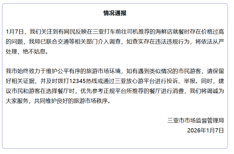 1月7日,三亚市市场监督管理局发布情况通报:近日,我们关注到有网民反映在三亚打车前往司机推荐的海鲜店就餐时存在价格过高的问题,三亚市市场监督管理局已和交通等相关部门介入调查,如查实存在违法违规行为决不姑息,并依法严肃处理。