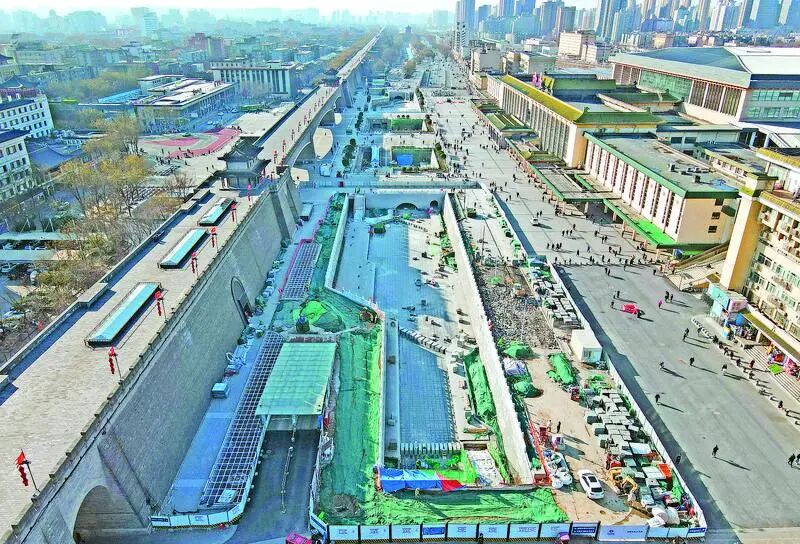 1月6日,西安火车站城墙下的护城河改造现场一派忙碌景象,工人们有的在给新栽的绿植浇水,有的在规整建材、拆除脚手架。四个下沉区域大部分已完工,中间两个下沉区域还装有自动扶梯。据现场工作人员介绍,这项兼顾古城风貌与功能升级的改造工程,预计本月底完工。图为无人机视角下的西安火车站护城河改造现场。(西安报业全媒体记者 谢伟 摄)