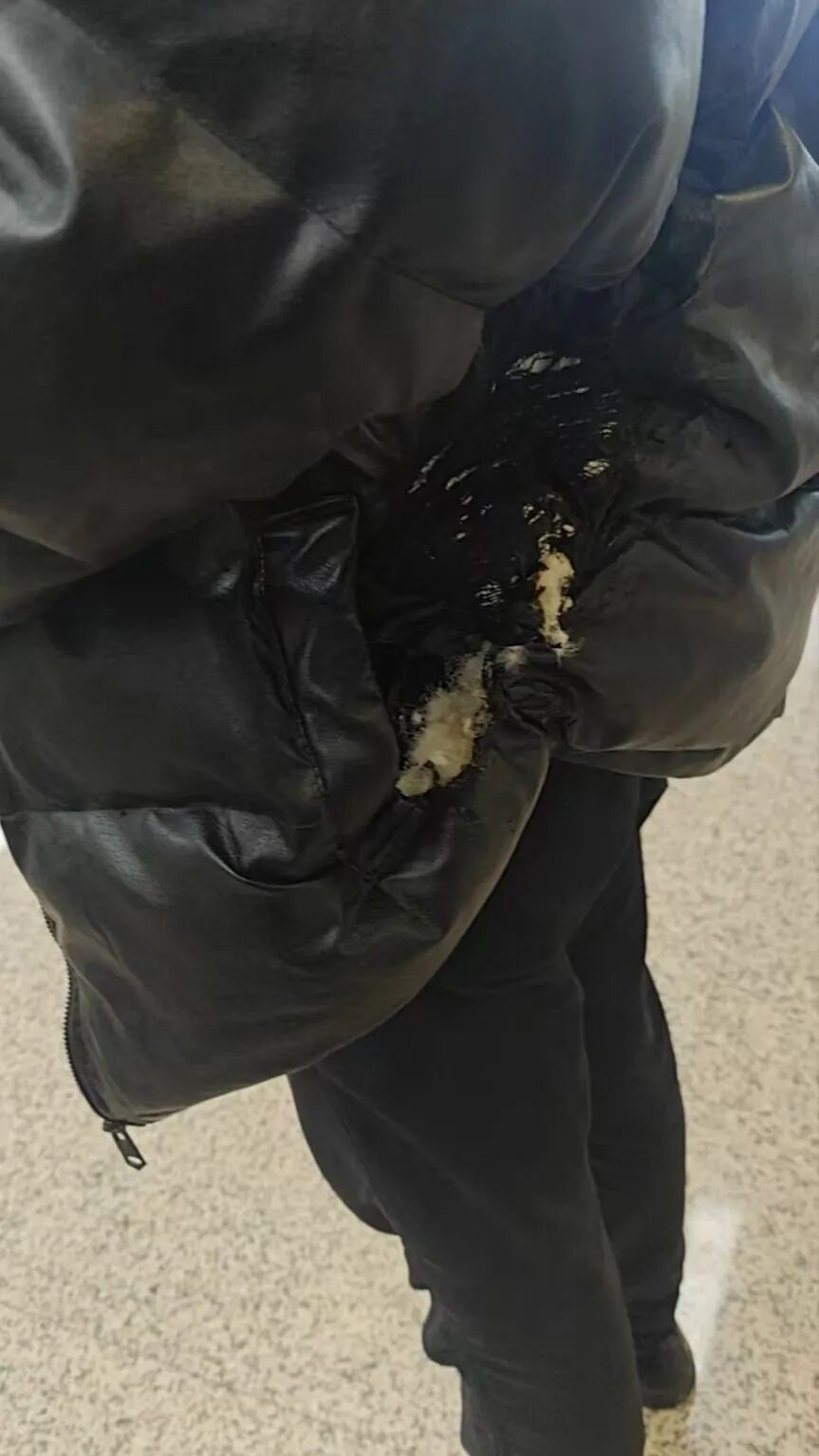 明火已将该乘客外套的口袋处烧穿,衣物一侧出现明显破损