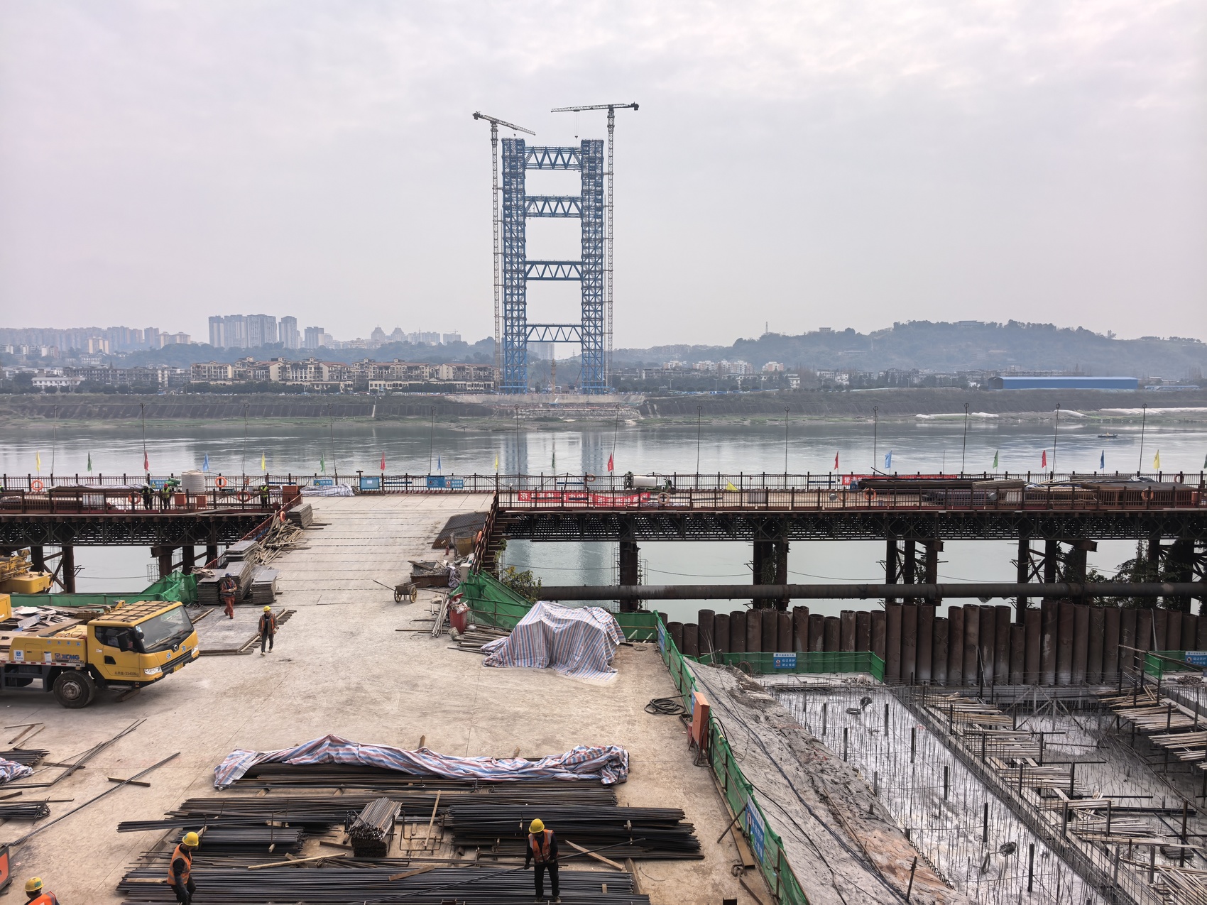 “泸州长江五桥南北两岸扣塔已实现顺利封顶,接下来将进行缆塔安装。”1月7日,在泸州长江五桥项目施工现场,两座高耸的蓝色扣塔隔江相望,拱座基坑内工人们正有序进行混凝土浇筑施工。