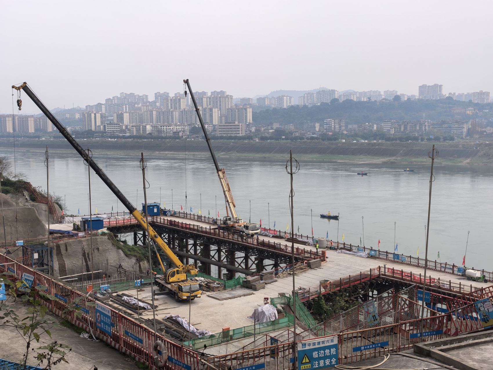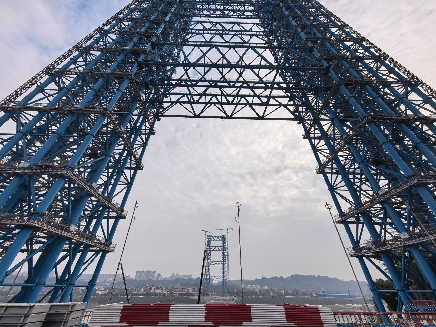 “扣塔是缆索吊装系统的关键组成部分,起到支撑和固定缆索的作用,像‘晾衣架’一样为桥梁吊装作业提供稳定结构。”中建六局泸州长江五桥项目经理房雄飞介绍,扣塔顺利封顶,为下一步缆塔施工以及缆索系统安装奠定了坚实的基础。北岸扣塔高174米、南岸扣塔高192米,“接下来的缆塔安装结构更复杂,涉及大量的焊接作业和高空作业,焊缝质量和施工安全将会是下一步重点管控的区域。”