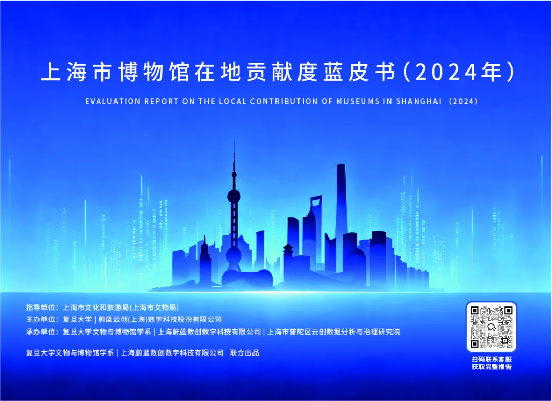 上海市于2021年6月率先提出“全面提升城市软实力”战略并于2022年12月提出打造“博物馆之都”。“上海市博物馆在地贡献度蓝皮书(2023年)”在此背景下应时而生,并在2024年6月27日于全国首发。“上海市博物馆在地贡献度蓝皮书(2024年)”在前一年的基础上,新增了评价指标数据比对等,以期通过第三方“评估”视角,既聚焦专业化和国际化维度,又用事实和数据说话,为上海文旅能级的质性提升呈送“文博方案”。该报告由上海市文化和旅游局(上海市文物局)指导,并由复旦大学文物与博物馆学系以及上海蔚蓝数创数字科技有限公司联合出品。