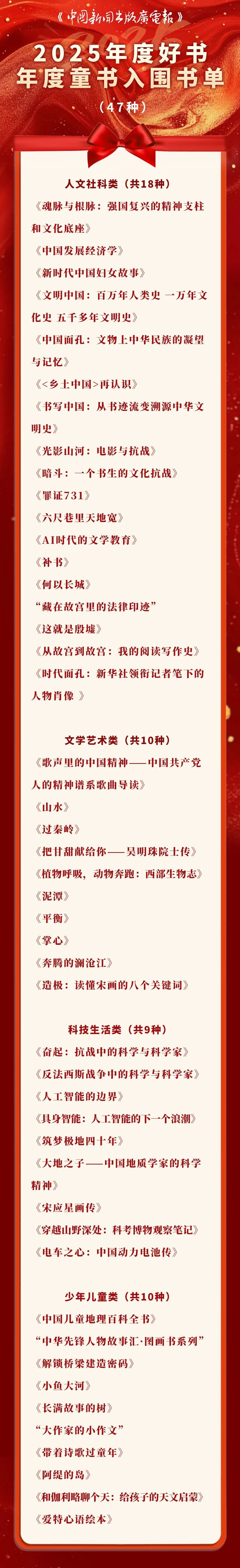 《中国新闻出版广电报》2025年度好书、年度童书入选书单今日发布。本次荐书活动吸引全国各地出版社自荐,同时依托本报优秀畅销书排行榜、读周刊微信公众号好书品读各书单,并参考在全社会具有广泛影响力的图书形成备选书目,经过初评、复评、终评等多环节最终产生入选书单。我们以此致敬创作者、出版人,也期待更多爱书人从中获得阅读的快乐。