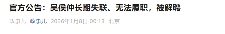 郑州市体育运动学校(郑州市体育中学)职工吴侯仲,身份证号:410104********0010,因你本人长期失联,无法履行工作职责,根据《事业单位人事管理条例》(国务院令第652号)规定,经研究决定,自2025年12月31日起解除单位与你的聘用关系,特此通知。
