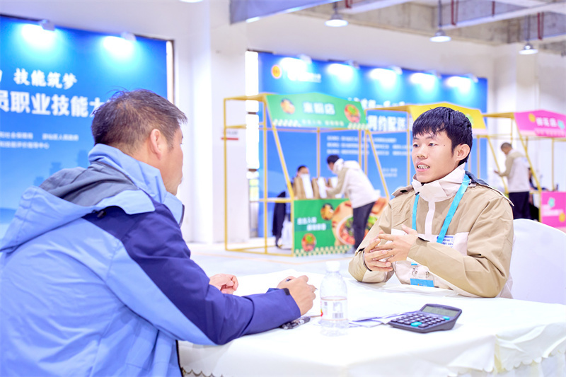 骑手赵明阳(右)参加2025年四川省网约配送员职业技能大赛,进行现场答辩。(受访者供图)