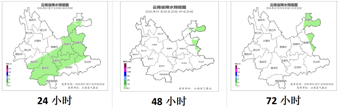 1月7日20时到01月08日20时:昭通市南部、曲靖市东部阴有小雪或雨夹雪,曲靖市西部、昆明市、玉溪市、文山州北部、红河州北部、普洱市、西双版纳州、临沧市、楚雄州南部阴天间多云局部有小雨,其他地区多云间晴。