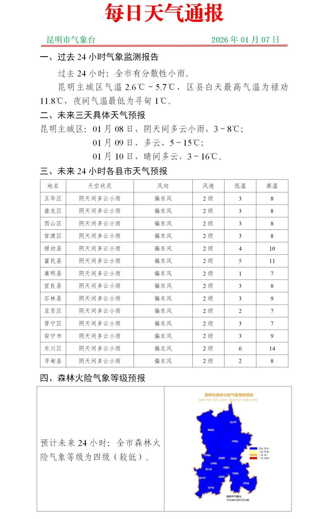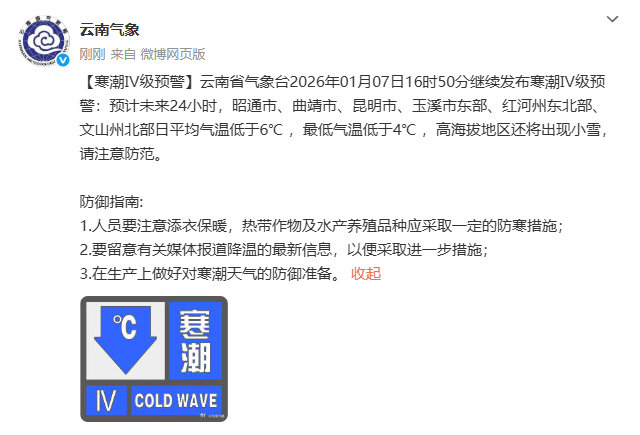 昆明市气象台2026年1月7日17时05分发布寒潮Ⅳ级预警:预计未来24小时,五华、盘龙、官渡、西山、呈贡、晋宁、安宁、嵩明、宜良、石林、富民、禄劝、寻甸、东川大部地区日平均气温低于6℃,最低气温低于4℃,高海拔山区还将出现雨夹雪或小雪,请注意防范。