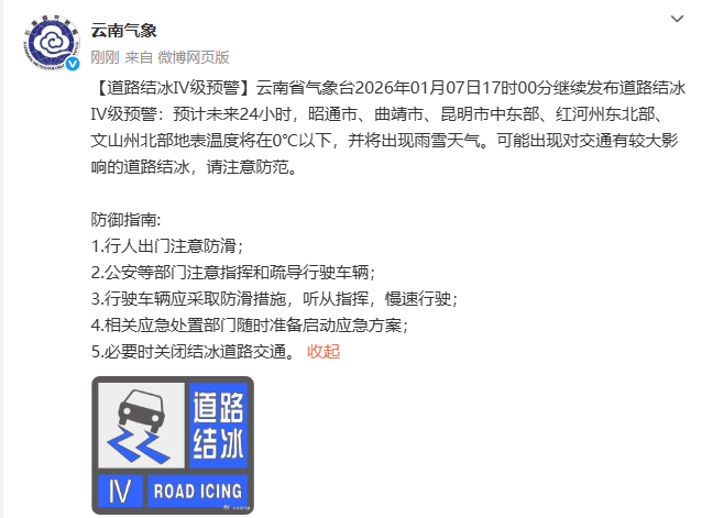 17时,云南省气象台继续发布道路结冰Ⅳ级预警:预计未来24小时,昭通市、曲靖市、昆明市中东部、红河州东北部、文山州北部地表温度将在0℃以下,并将出现雨雪天气,可能出现对交通有较大影响的道路结冰,请注意防范。