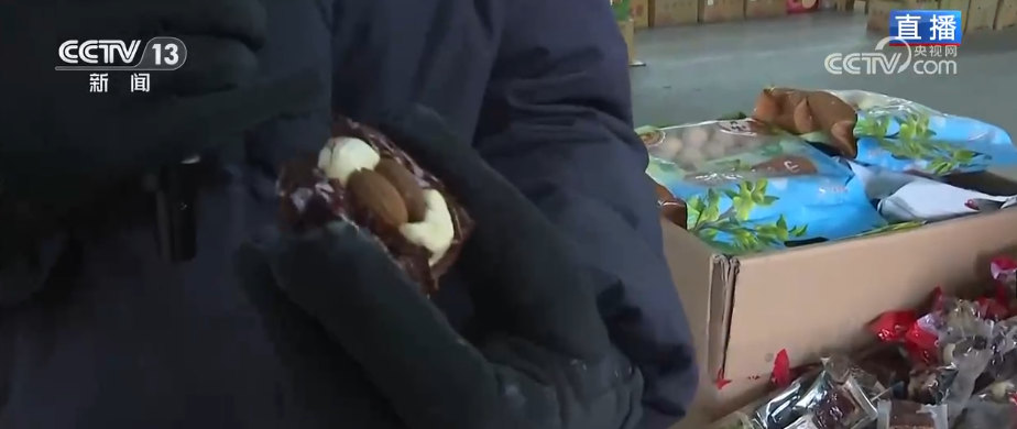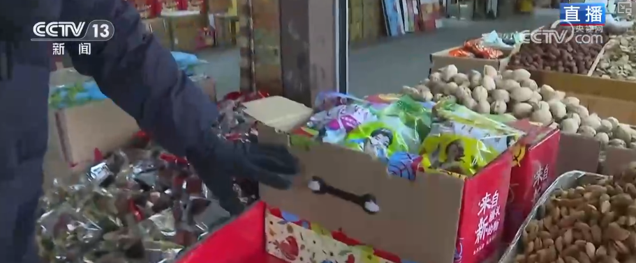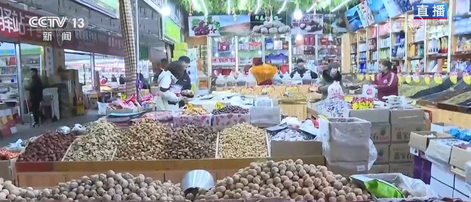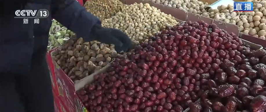 商家也会用心推出一些干果礼盒,比如像这个,一盒里装十种新疆特色干果,每种干果500克,仿佛把整个秋天的美味、新疆的美味都装了进来,特别受欢迎。而且这两年,还有一种特色的“干果组合”也是新卖点。像这种“枣夹核桃”,是把红枣和核桃加工组合到一起,吃起来既有核桃的香又有红枣的糯甜。另外还有这种腰果、巴旦木和红枣组合在一起的“枣园三结义”,也非常好吃热卖,都是节前市场的第一拨“年货冠军”。 线上直播与线下消费联动 交易热度攀升