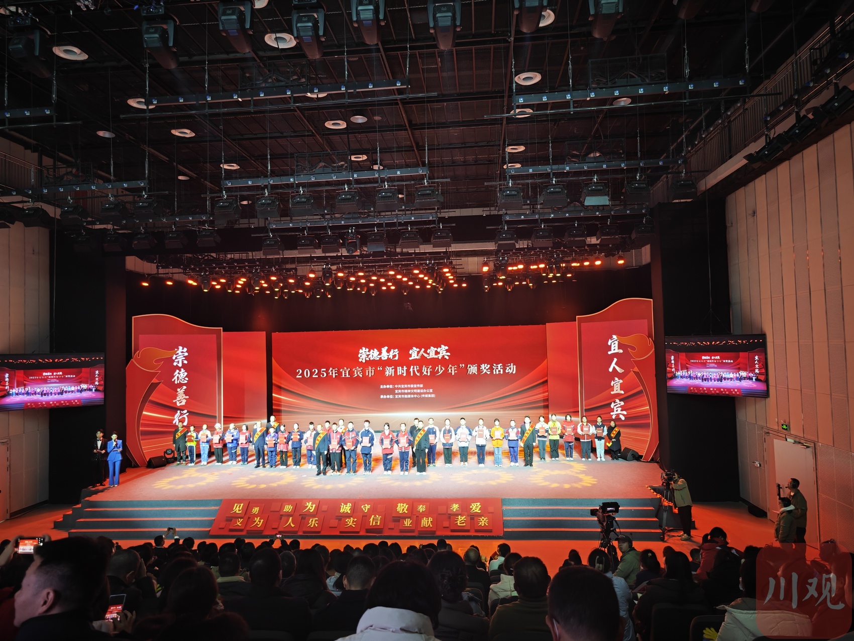 与以往不同,本次颁奖仪式创新融合了“宜宾好人”的榜样引领与“新时代好少年”的蓬勃朝气。活动现场,“宜宾好人”代表转身为30名“新时代好少年”颁奖,完成了一场温暖的道德接力。同时,他们共同宣读《“崇德善行 宜人宜宾”倡议书》,呼吁践行美德、弘扬新风。