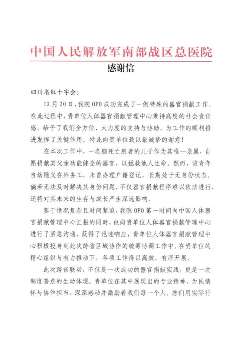 近日,四川省红十字会收到中国人民解放军南部战区总医院的感谢信,信中高度赞扬了四川省人体器官捐献管理中心在本次生命接力赛程中的大力支持和辛勤付出。