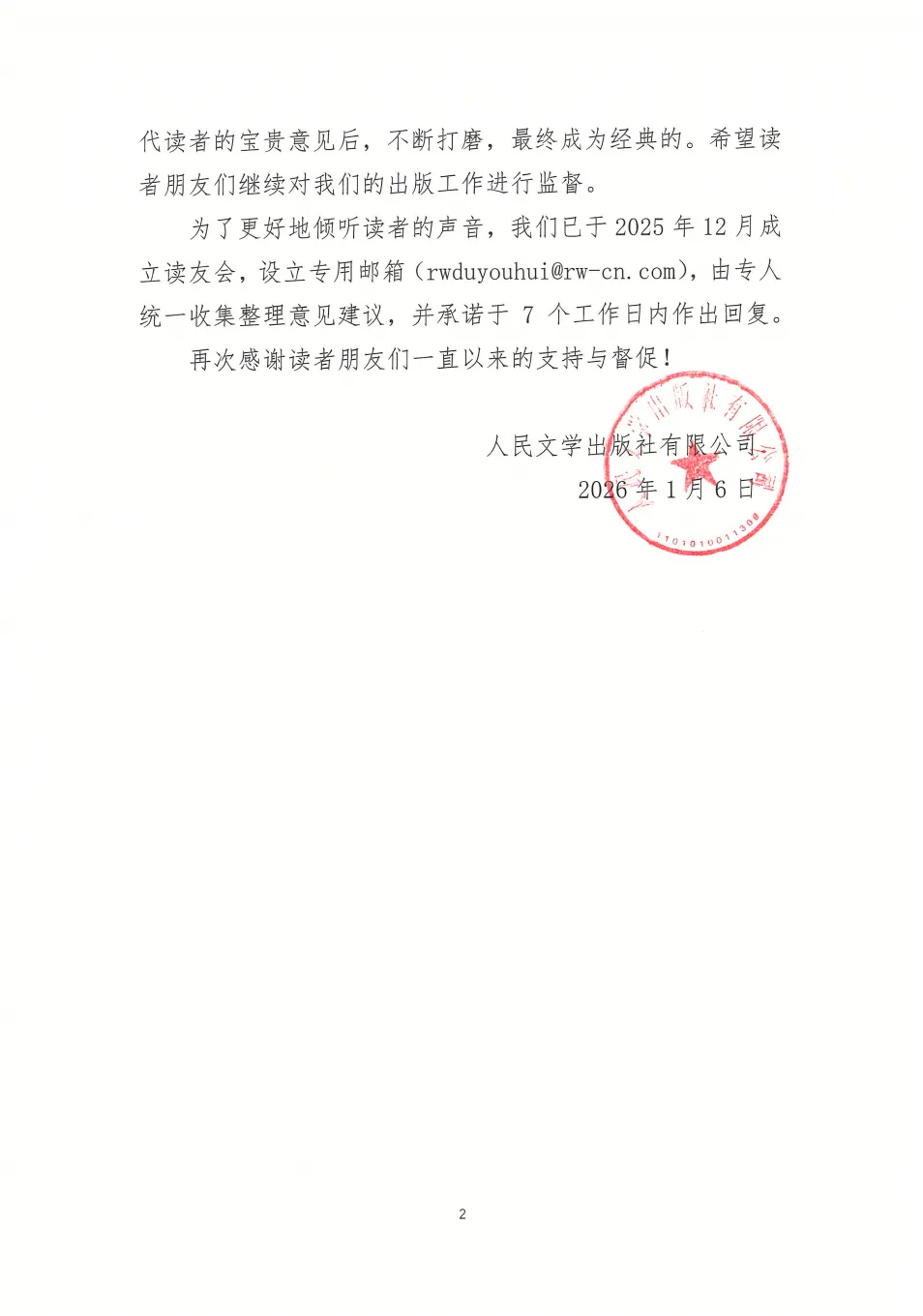 信中称:“知错即改一直是人民文学出版社坚守的出版态度与责任担当。”同时出版社提到,已于2025年12月成立读友会,设立专用邮箱(rwduyouhui@rw-cn.com)收集读者意见,并承诺在7个工作日内予以回复。
