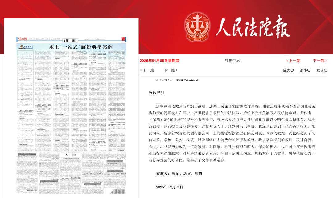1月8日,人民法院报第3版公告栏显示,此前引发热议的海底捞“小便门”事件当事人唐某及其父母发布致歉声明,内容如下: