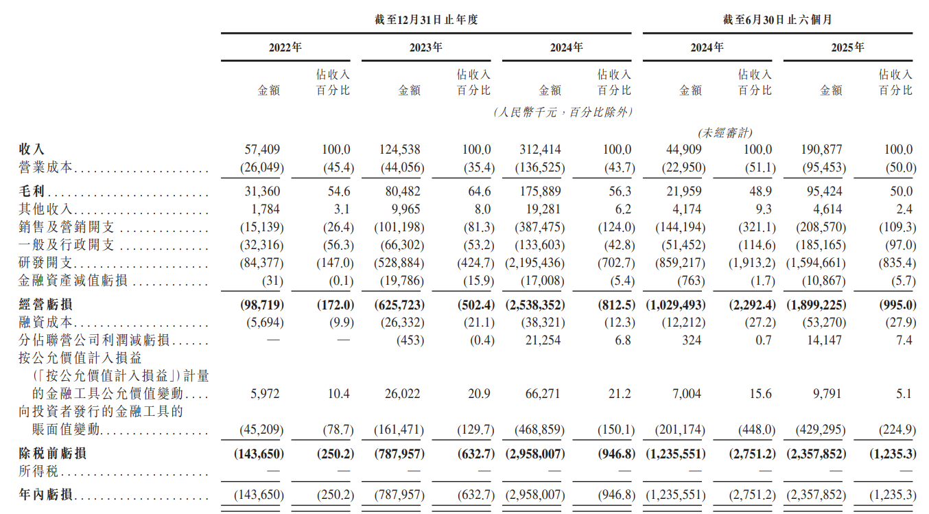 业绩方面,2022年至2024年以及2025年上半年,智谱的营收分别为5740.9万元、1.25亿元、3.12亿元、1.91亿元。但营收高速增长的背后是持续扩大的亏损——同期公司净亏损分别为1.44亿、7.88亿、29.58亿元以及23.58亿元,三年半累计亏损超过62亿元。