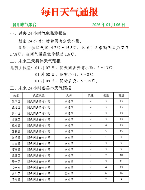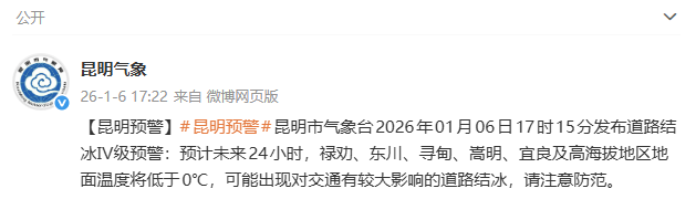 据昆明市气象台官方微博@昆明气象 消息,昆明市气象台2026年01月06日17时15分发布道路结冰Ⅳ级预警:预计未来24小时,禄劝、东川、寻甸、嵩明、宜良及高海拔地区地面温度将低于0℃,可能出现对交通有较大影响的道路结冰,请注意防范。