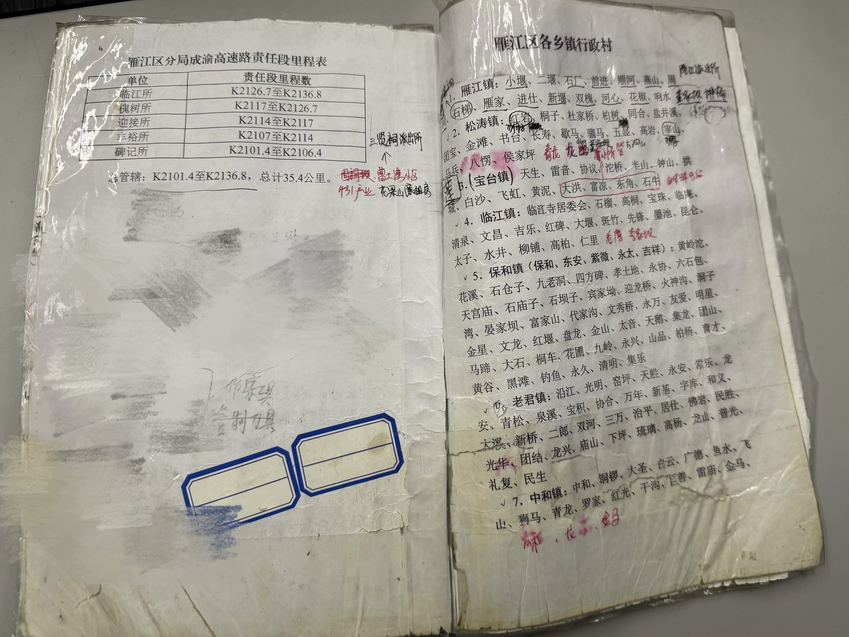 面对提问,郭辉霞抱来一本厚厚的资料册,册子上记录着各乡镇行政村的划分以及各联动单位的值班电话。泛黄的纸张上满是胶带粘贴的痕迹与密密麻麻的笔迹,频繁的翻阅早已让册子边缘卷起。