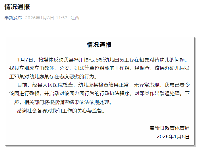1月8日,江西宜春市奉新县教育体育局发布情况通报: