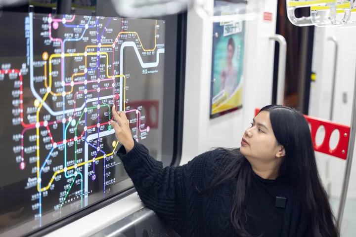 2025年2月20日,泰国博主李佩英在重庆轨道交通1号线上拍摄体验智能车窗。(新华社发)