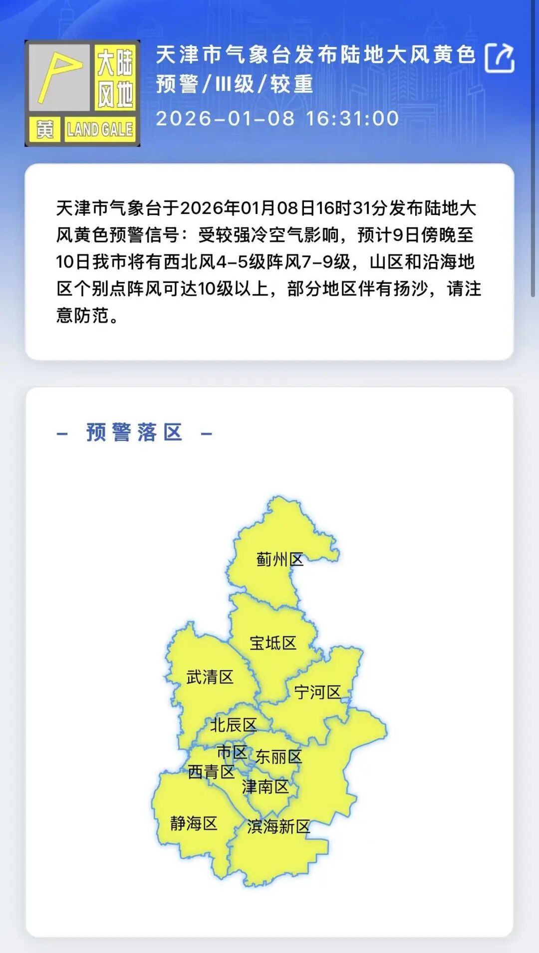 天津市气象台于2026年01月08日16时31分发布陆地大风黄色预警信号: