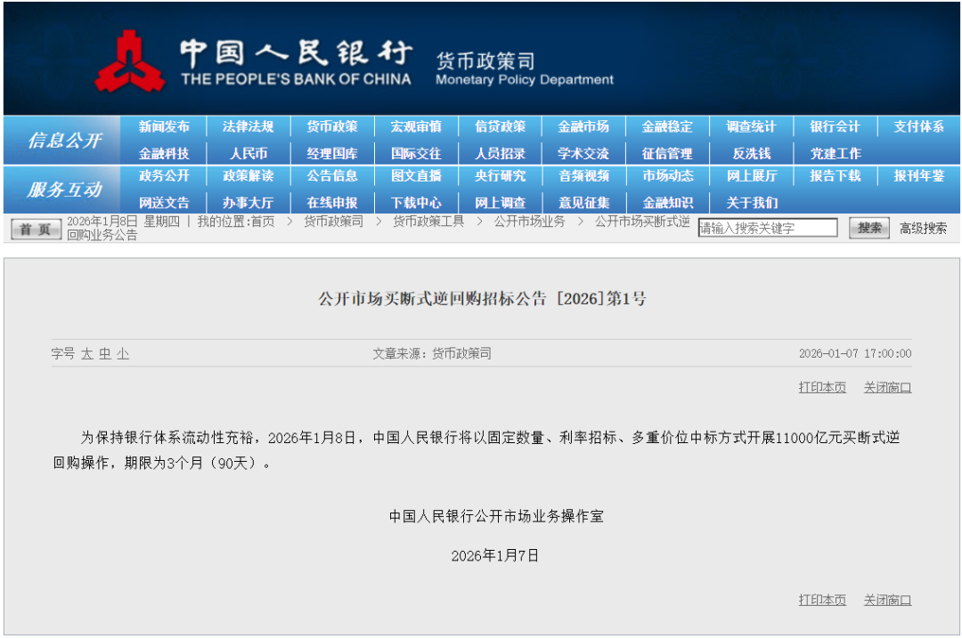 据中国人民银行网站消息,为保持银行体系流动性充裕,中国人民银行1月8日以固定数量、利率招标、多重价位中标方式开展11000亿元买断式逆回购操作,期限为3个月(90天)。