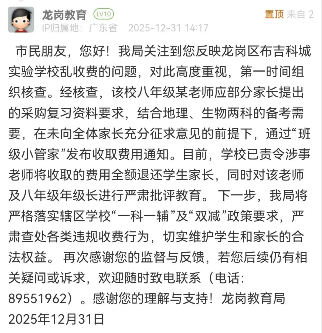 我局关注到您反映龙岗区布吉科城实验学校乱收费的问题,对此高度重视,第一时间组织核查。经核查,该校八年级某老师应部分家长提出的采购复习资料要求,结合地理、生物两科的备考需要,在未向全体家长充分征求意见的前提下,通过“班级小管家”发布收取费用通知。目前,学校已责令涉事老师将收取的费用全额退还学生家长,同时对该老师及八年级年级长进行严肃批评教育。 下一步,我局将严格落实辖区学校“一科一辅”及“双减”政策要求,严肃查处各类违规收费行为,切实维护学生和家长的合法权益。 再次感谢您的监督与反馈,若您后续仍有相关疑问或诉求,欢迎随时致电联系(电话:89551962)。感谢您的理解与支持!