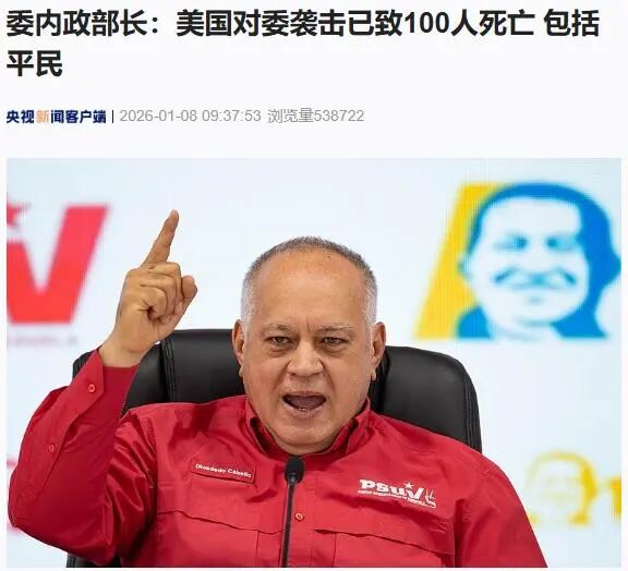 当地时间7日,委内瑞拉内政部长迪奥斯达多·卡韦略表示,美国1月3日对委的袭击已造成100人死亡,其中包括平民。此外,第一夫人西利娅·弗洛雷斯在突袭行动中头部受伤,总统马杜罗腿部受伤。