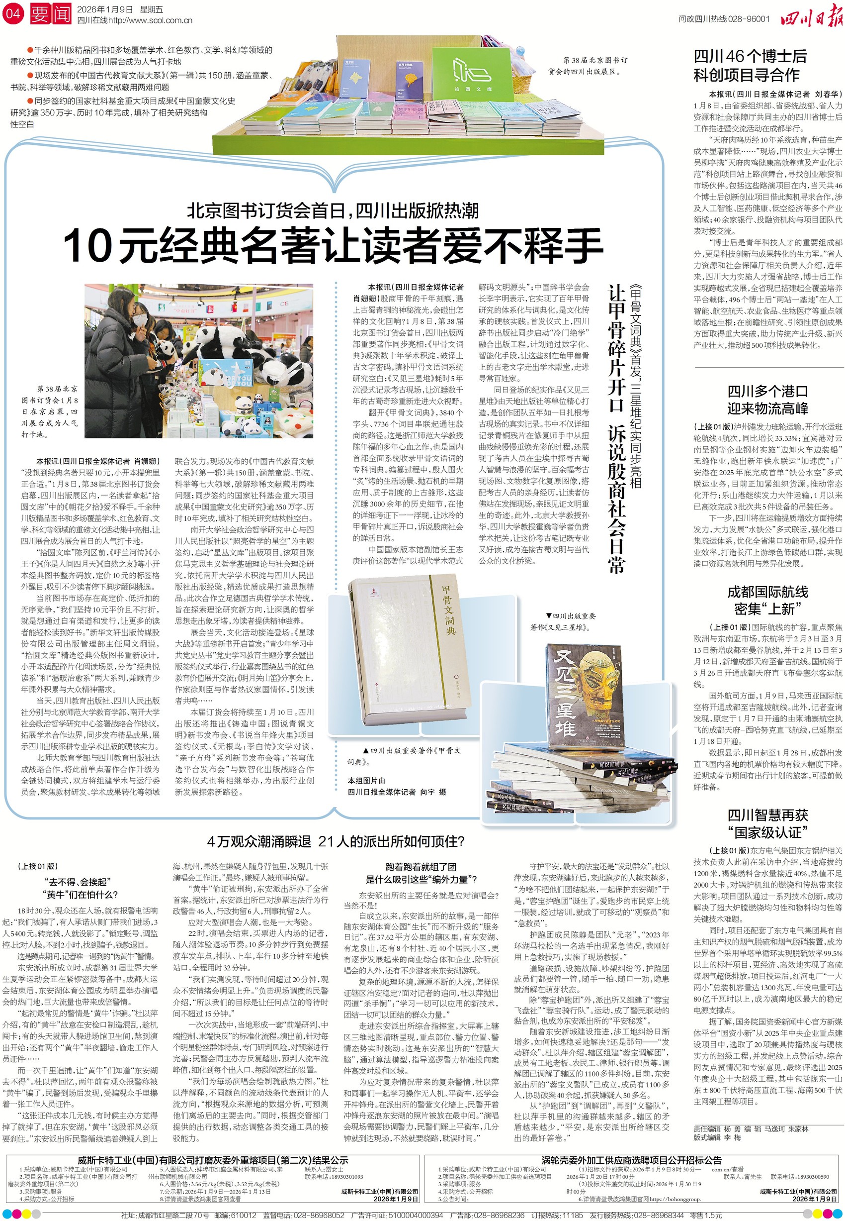 1月8日,第38届北京图书订货会启幕,千余种川版精品图书和多场覆盖学术、红色教育、文学、科幻等领域的重磅文化活动集中亮相,让四川出版展区成为订货会现场人气打卡地。今日四版,直击四川出版掀起的悦读热潮。