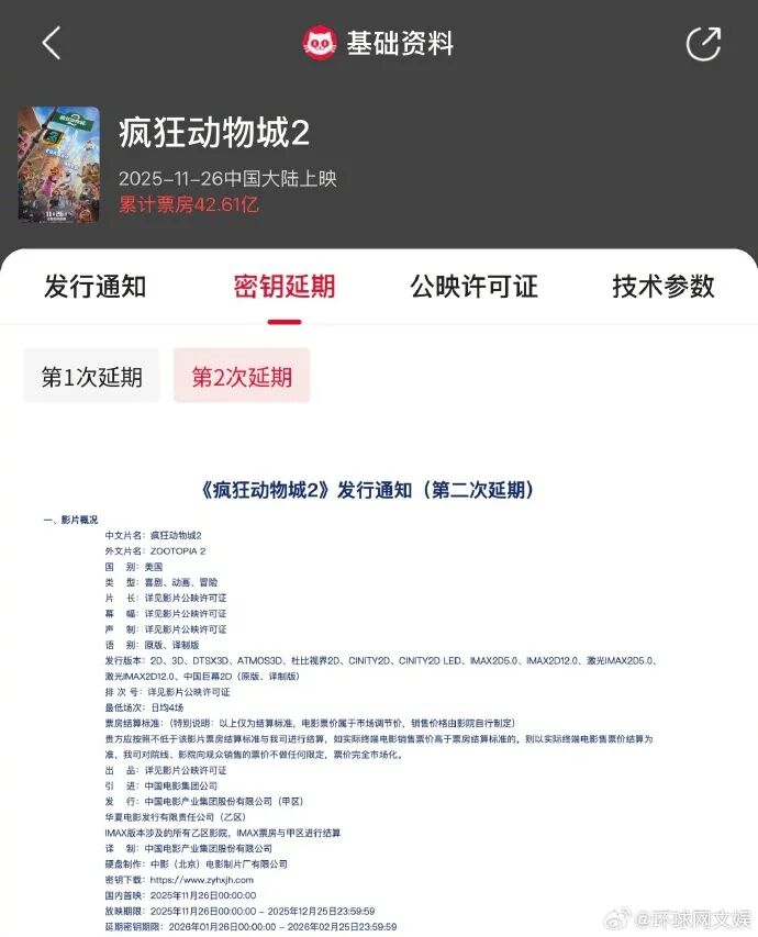 1月8日消息,据猫眼专业版数据,《疯狂动物城2》密钥第二次延期,延长上映至2026年2月25日,截至当前累计票房已超42.61亿元,成中国影史进口片票房冠军。