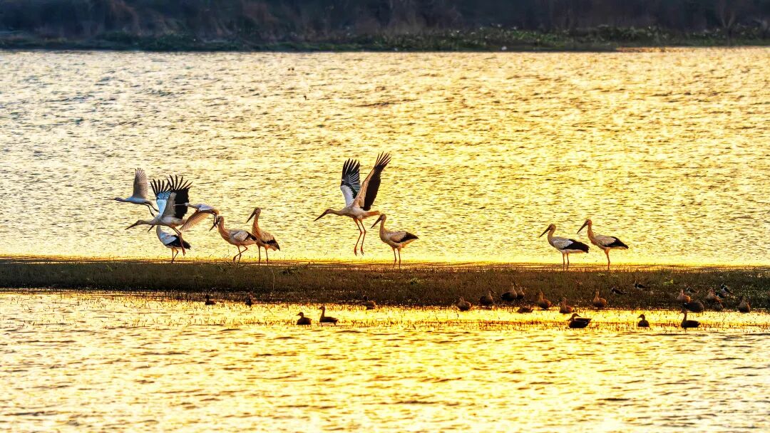 东方白鹳在仙女湖金色的水面上“舞蹈”。袁建兵摄