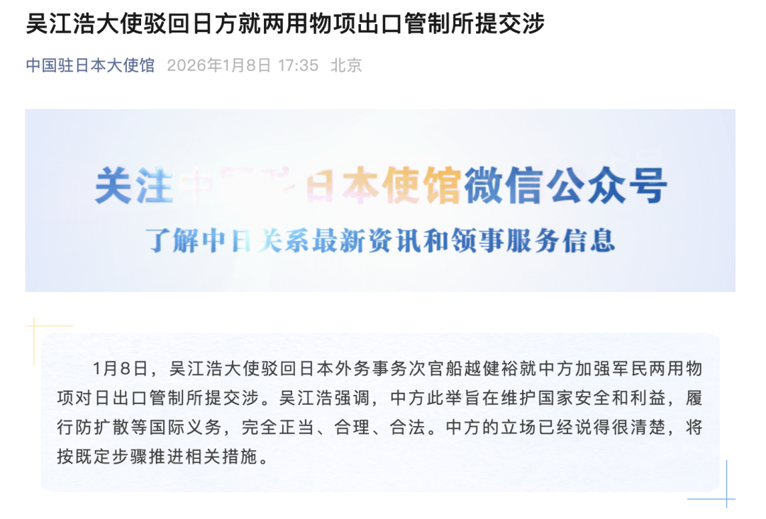 1月8日,据中国驻日本大使馆消息,吴江浩大使驳回日本外务事务次官船越健裕就中方加强军民两用物项对日出口管制所提交涉。
