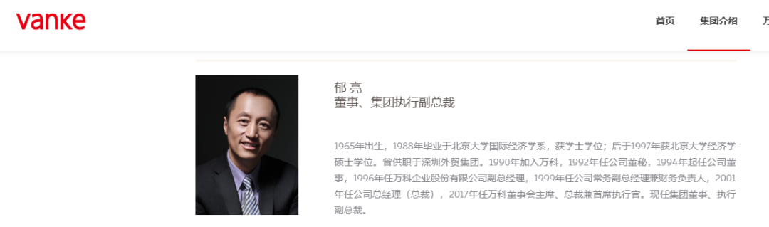 郁亮出生于1965年,已年满60周岁。万科官网信息显示,其1988年毕业于北京大学国际经济学系,获学士学位;后于1997年获北京大学经济学硕士学位。曾供职于深圳外贸集团。1990年加入万科,1992年任公司董秘,1994年起任公司董事,1996年任万科企业股份有限公司副总经理,1999年任公司常务副总经理兼财务负责人,2001年任公司总经理(总裁),2017年任万科董事会主席、总裁兼首席执行官。2025年1月,万科管理团队进行调整,郁亮辞去董事会主席职务,担任集团董事、执行副总裁。