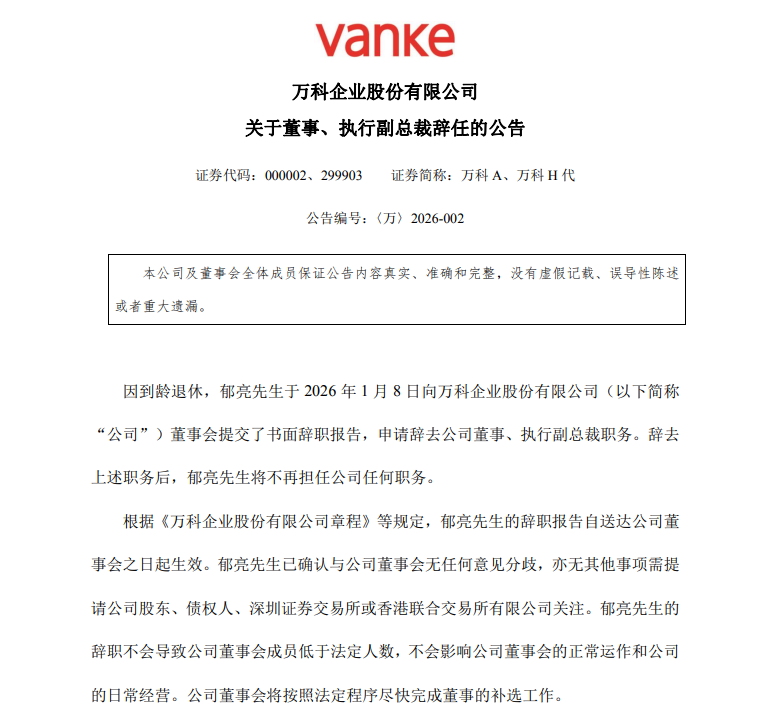 1月8日,万科企业股份有限公司(万科A,000002.SZ)发布公告,因到龄退休,郁亮于2026年1月8日向万科董事会提交了书面辞职报告,申请辞去公司董事、执行副总裁职务。辞去上述职务后,郁亮先生将不再担任公司任何职务。