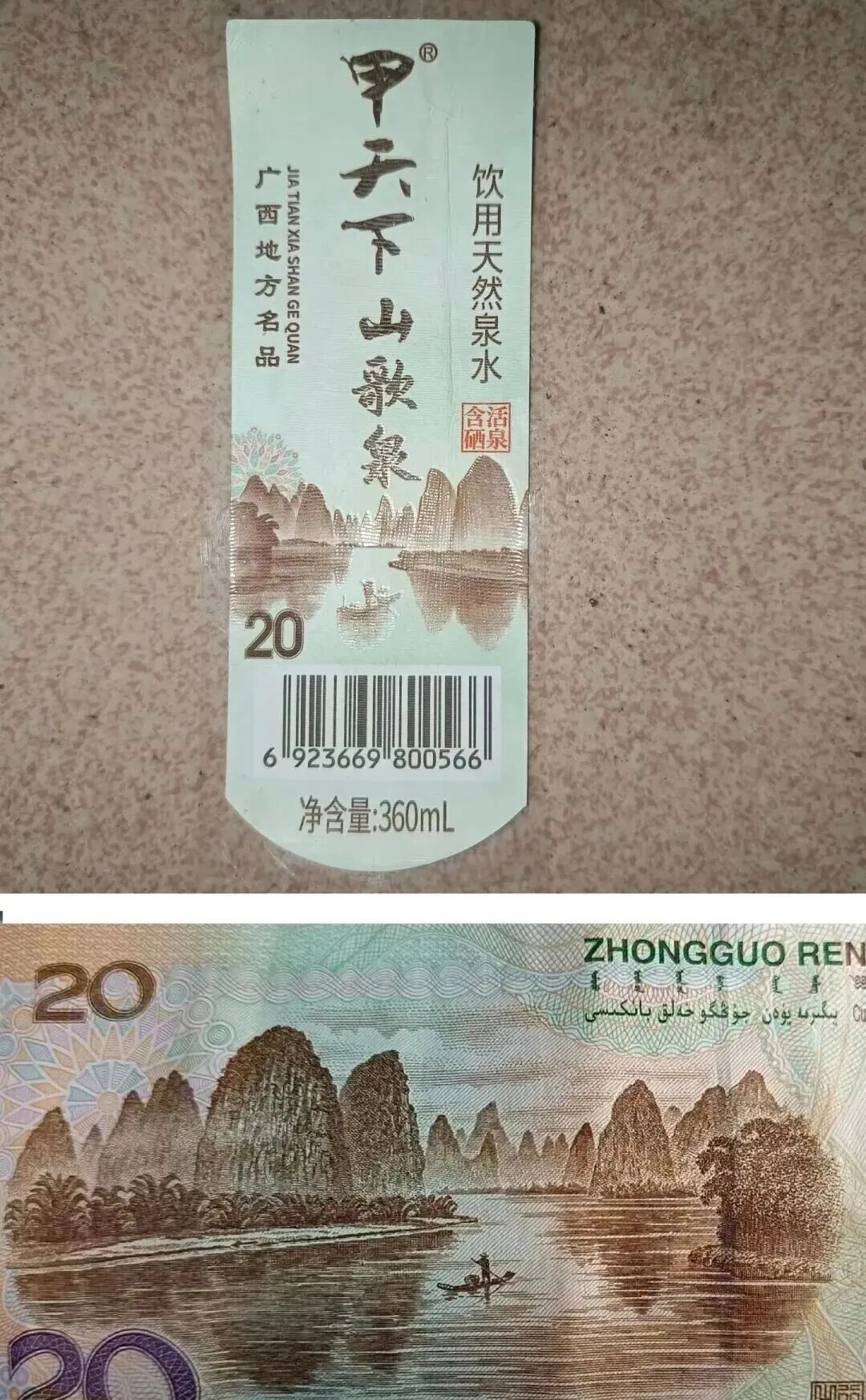 图片显示,一张名为“广西地方名品”“甲天下山歌泉”的矿泉水标签下部,印有与第五套人民币20元纸币背面高度相似的桂林山水图案,并在图案左下角标注“20”字样。该图案采用具有凹凸反光质感,印刷工艺讲究。