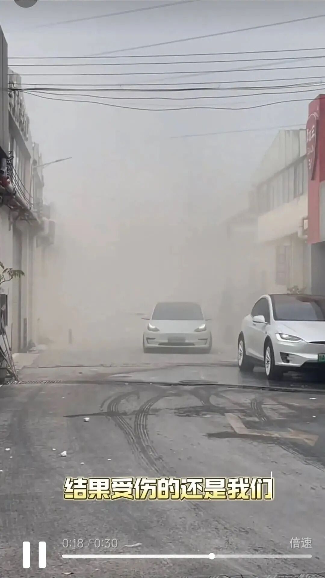 在网传视频中,一台设备对着铲车吹风,铲车掘起的泥土砖瓦,随风扬起漫天沙尘,能见度只有两三米。