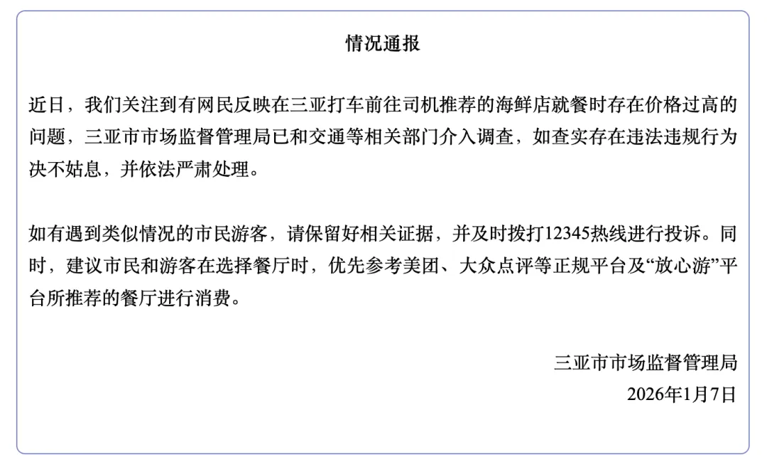 1月7日,三亚市市场监督管理局发布情况通报称,关注到有网民反映在三亚打车前往司机推荐的海鲜店就餐时存在价格过高的问题,三亚市市场监督管理局已和交通等相关部门介入调查。