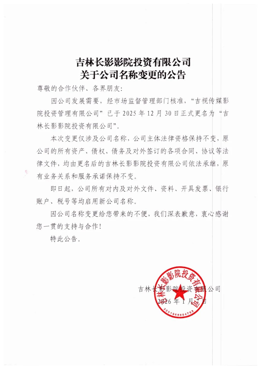 本次变更仅涉及公司名称,公司主体法律资格保持不变,原公司的所有资产、债权、债务及对外签订的各项合同、协议等法律文件,均由更名后的吉林长影影院投资有限公司依法承继,原有业务关系和服务承诺保持不变。