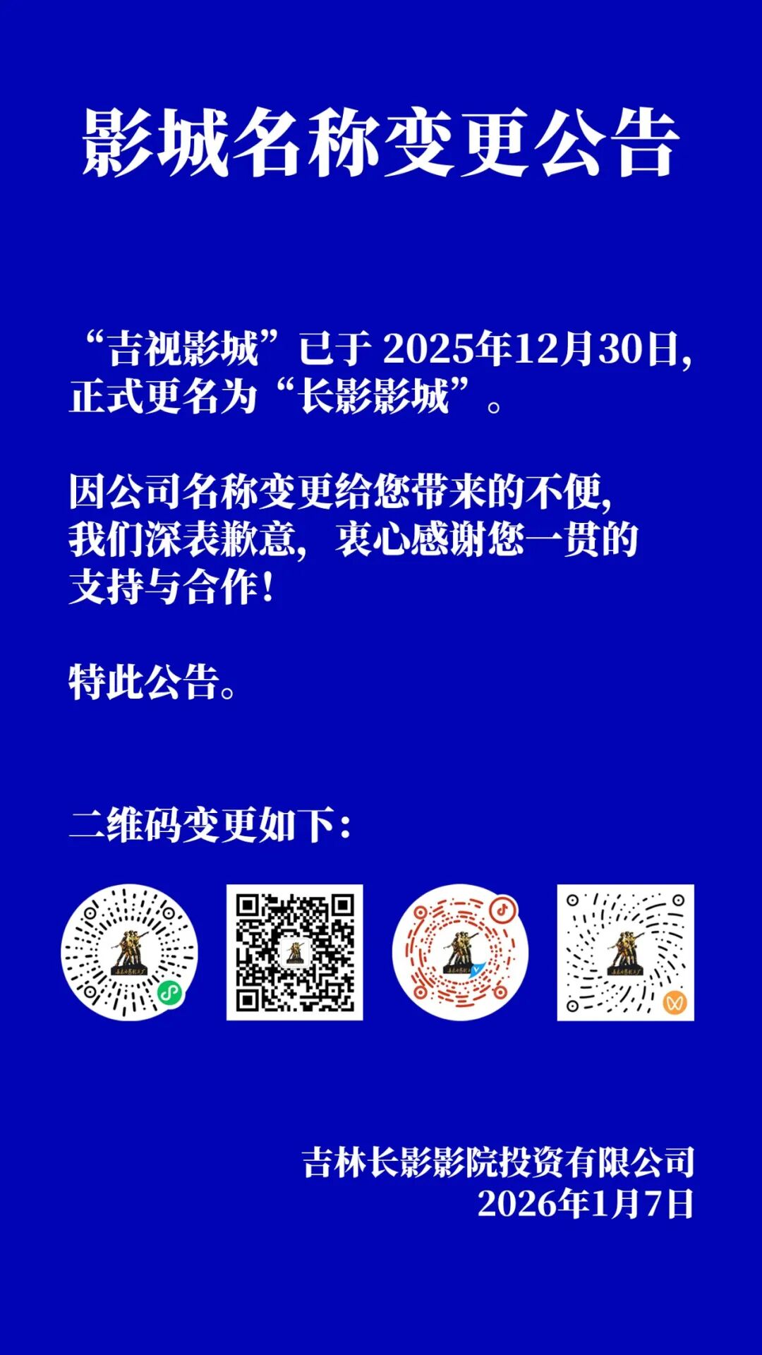 日前,吉林长影影院投资有限公司发布公告,“吉视影城”已于近日正式更名为“长影影城”。
