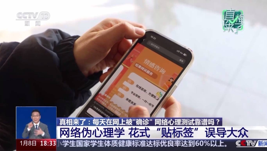 总台央视记者 牟媞媞:把原本非常严肃的心理学知识简化、歪曲,炮制出“贴标签”“下定论”的快餐式内容,更有甚者借着伪心理学的噱头,推出高价心理课程、付费测评、所谓的心理咨询服务,形成“流量变现”的灰色链条。