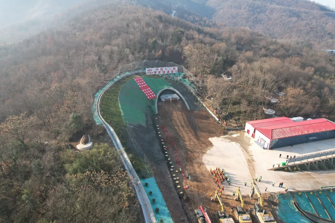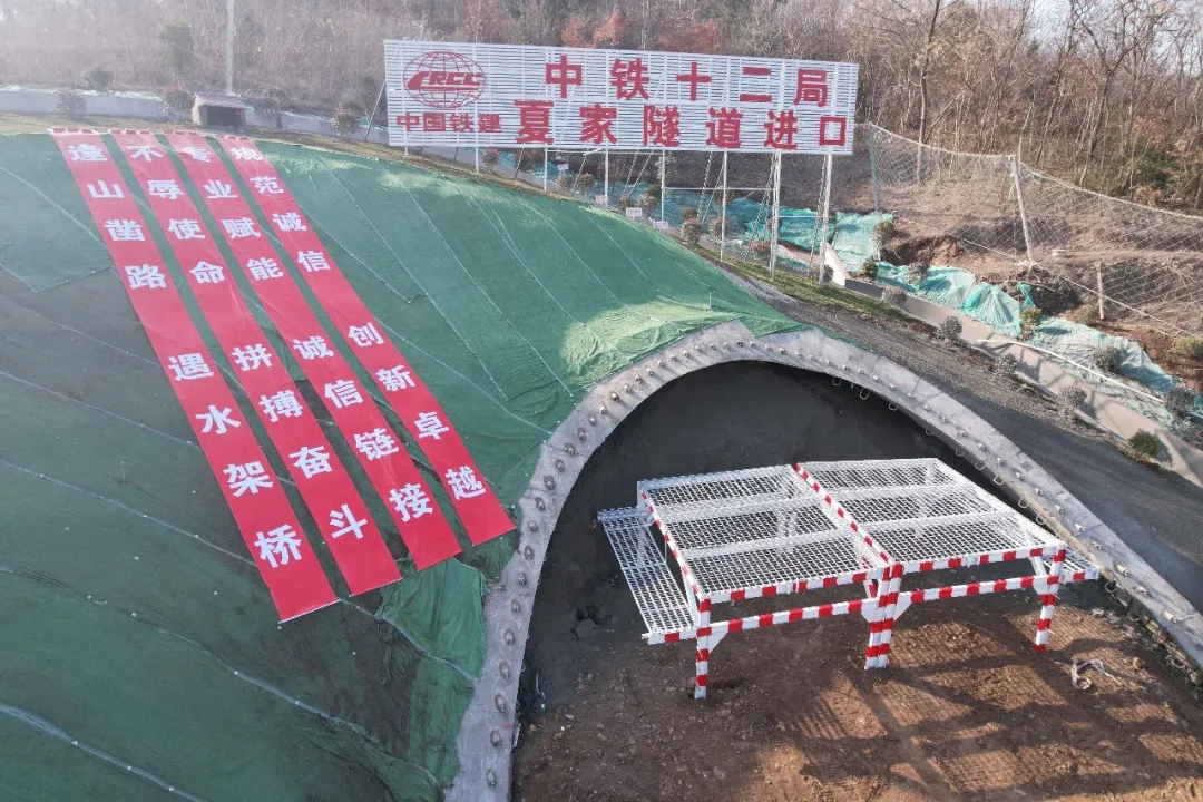 夏家隧道地处安徽省铜陵市枞阳县会宫镇建设村及拔茅村,全长1676米,最大埋深约为148米,为设计时速250公里的单洞双线隧道。隧道划分为两个全工序机械化配套工区施工建设,首次采用贴壁式进洞施工工艺,穿越复杂地质构造,面临断层、地应力、下穿水塘等多重挑战。