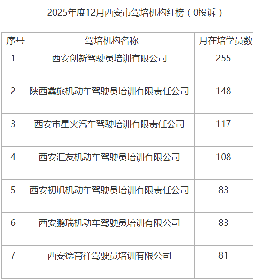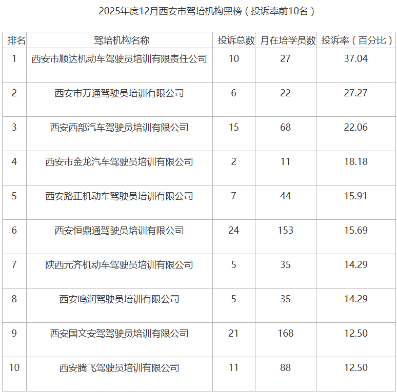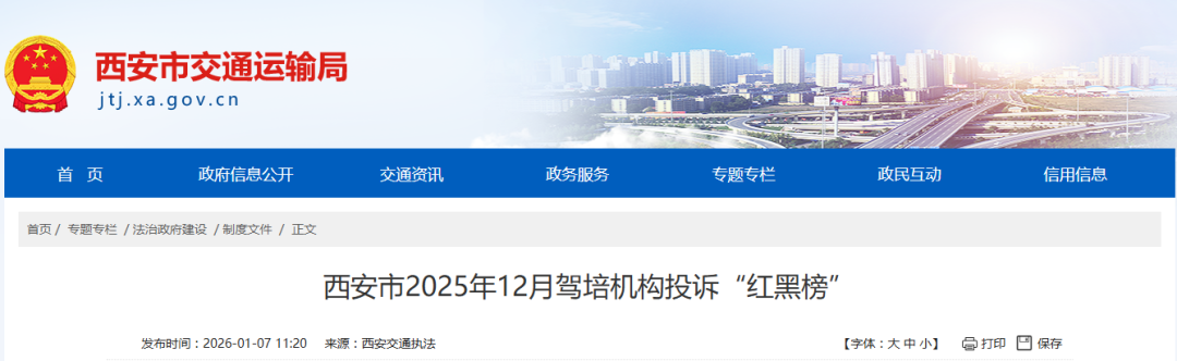 近日,西安市交通运输局官网发布西安市2025年12月驾培机构投诉“红黑榜”。以下为详情: