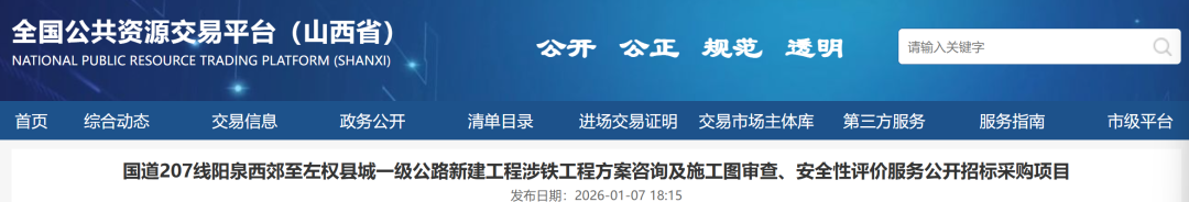 《国道207线阳泉西郊至左权县城一级公路新建工程涉铁工程方案咨询及施工图审查、安全性评价服务公开招标采购项目》显示,本项目建设地点为山西省阳泉市平定县;山西省晋中市昔阳县、和顺县、左权县。此次招标由山西路桥建设集团阳左公路建设管理有限公司主导,覆盖项目设计环节。