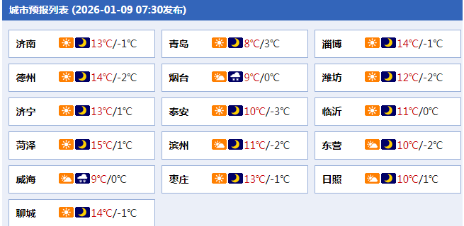 最高气温:滨州、东营、鲁中山区和半岛地区6℃左右,菏泽和济宁12℃左右,其他地区9℃左右。