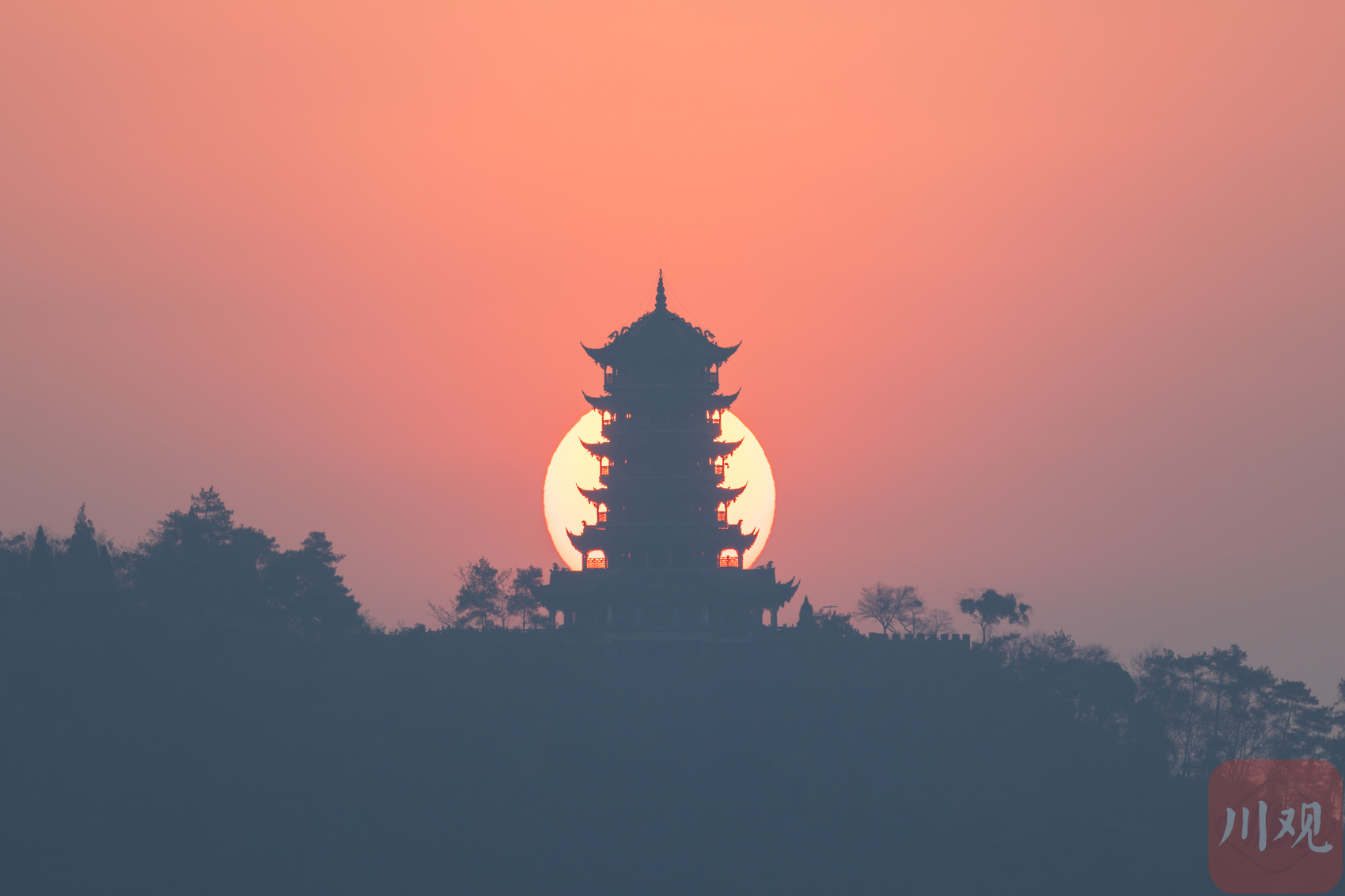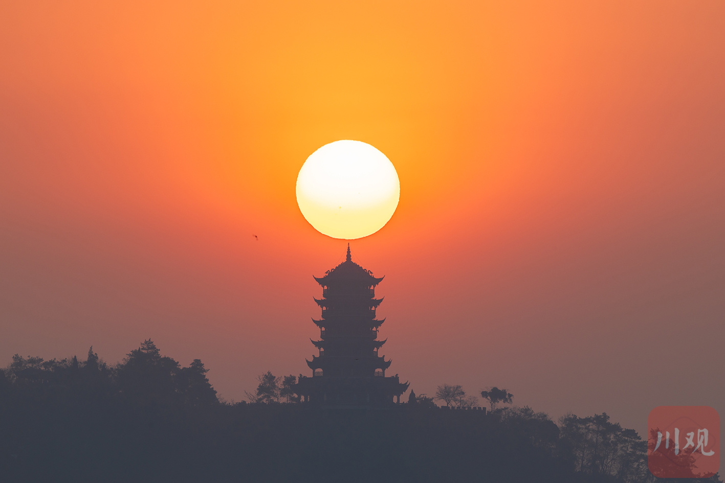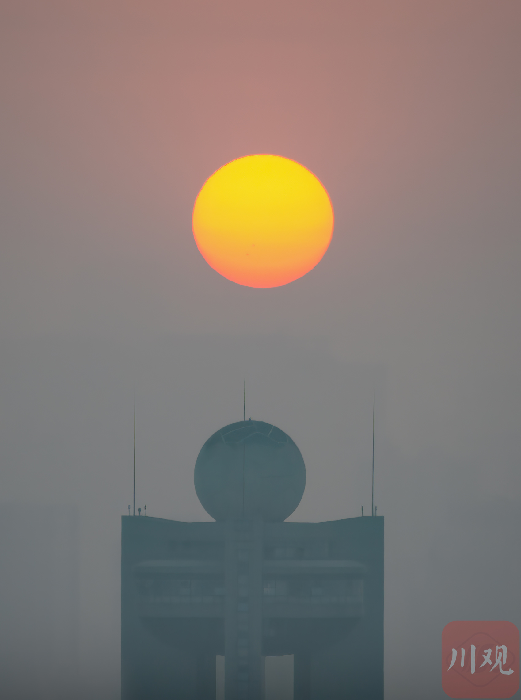 四川省气象局大楼旁,红日与雷达球 “双球” 同框升起,画面别具一格。