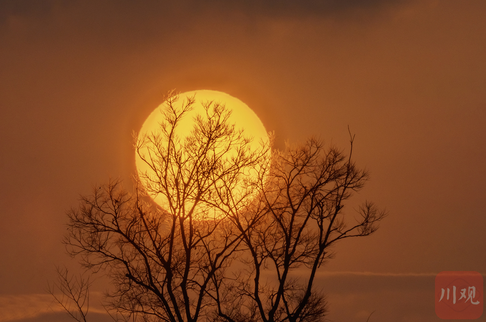 金堂县城毗河边,光秃枝桠与暖光交织,勾勒出冬日黄昏的疏朗剪影。