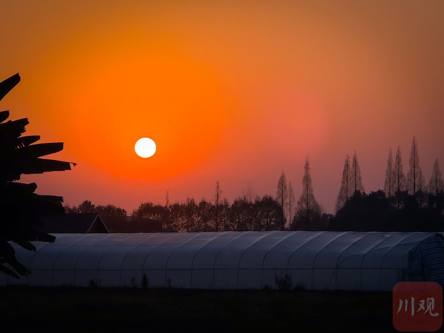 晨光下大棚与树林的剪影。