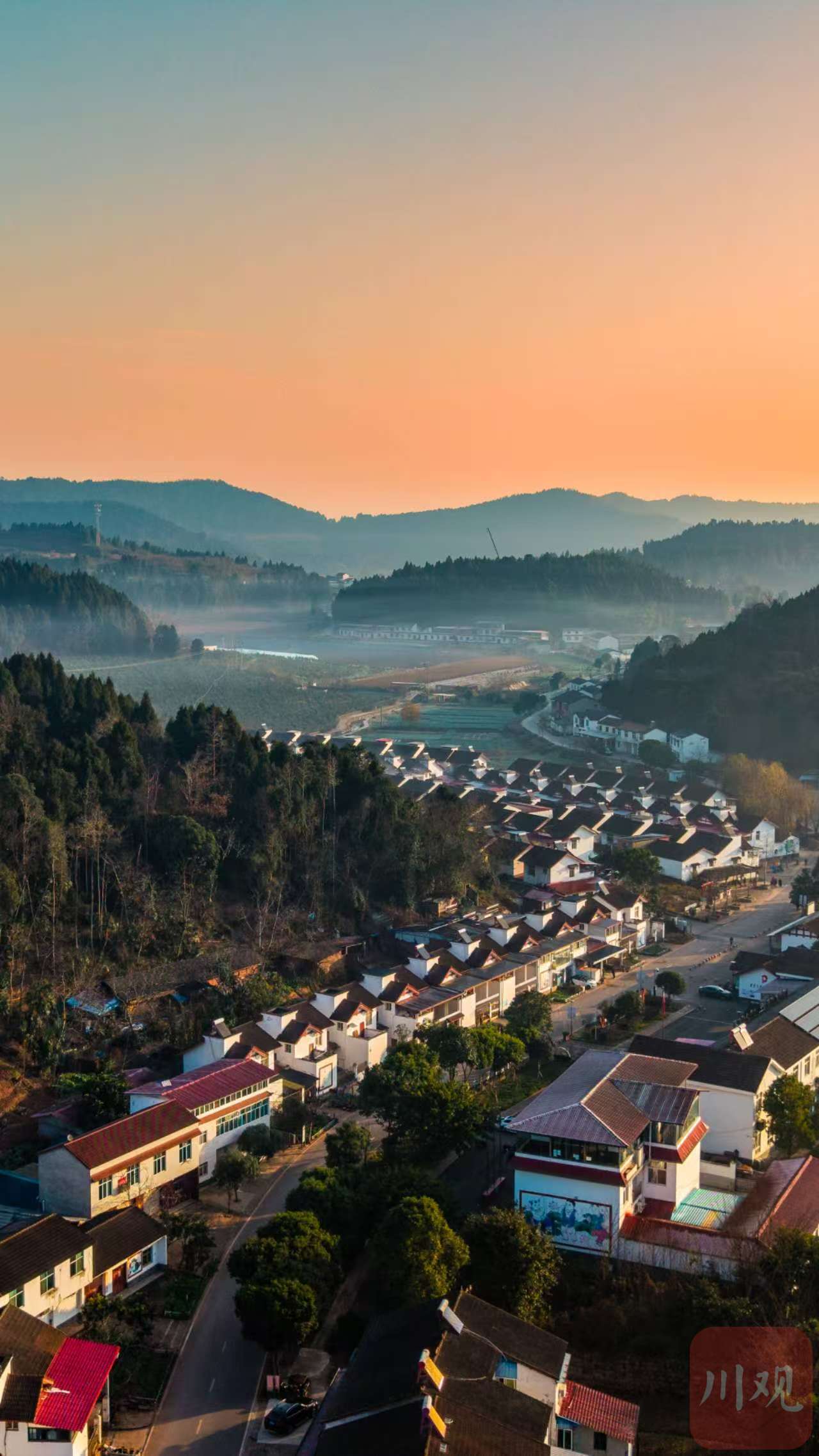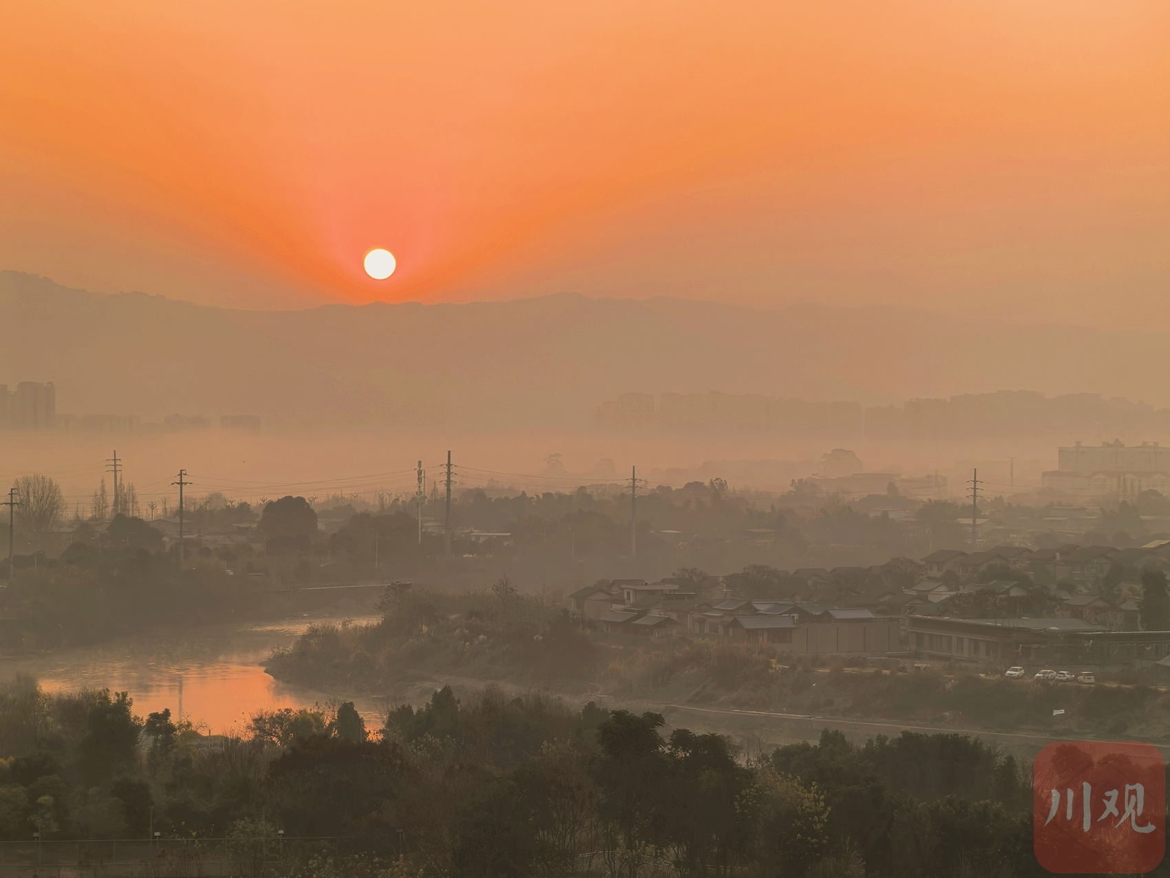 晨雾氤氲中,橙红朝阳为成都金堂县赵镇蒙上一层柔纱。